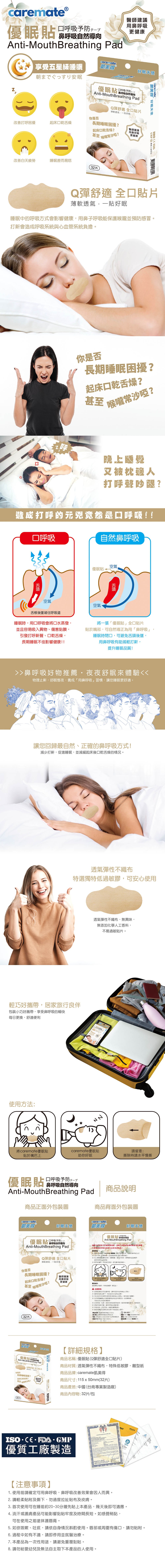 本產品為全口貼片,貼於嘴部可自然導正為用鼻呼吸,避免舌頭後墜,有助減輕打鼾,提升睡眠品質。